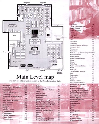 When fully opened, the fanfold Directory measures 16" x 10", and shows the remaining 3 levels of the Bookstore. The diagram at left summarizes each level.