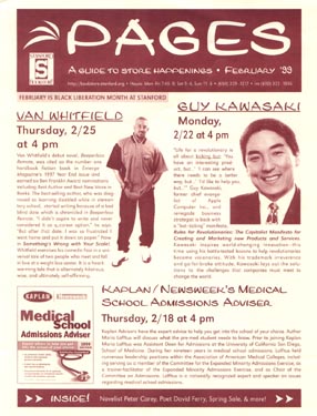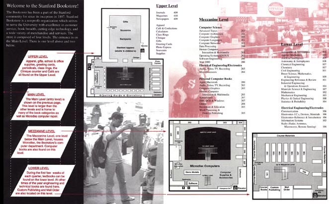 I redrew the Stanford Bookstore Directory, including recreating all maps in Illustrator. The Directory lists book categories and shelf numbers where they can be found.