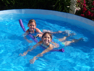 Below: Our front yard in the spring. Aubeni swims with neighbor Brianna. |