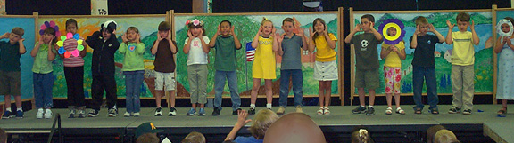 | Above: Aubeni's class spring sing-a-long. "Each of us is a flower..." Aubeni is the one in a yellow dress.