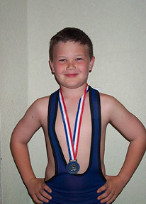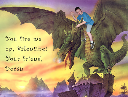 | Above and at Right: I have had a lot of fun the last several years making the kids personalized Valentine cards. Below left: Doran tried the wrestling club and loved it. Below right: Doran has a "bumpy" 10th birthday party in March. |